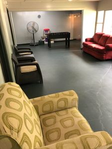 We have a nice sitting area complete with foosball table, toys for your little ones, and an elliptical.